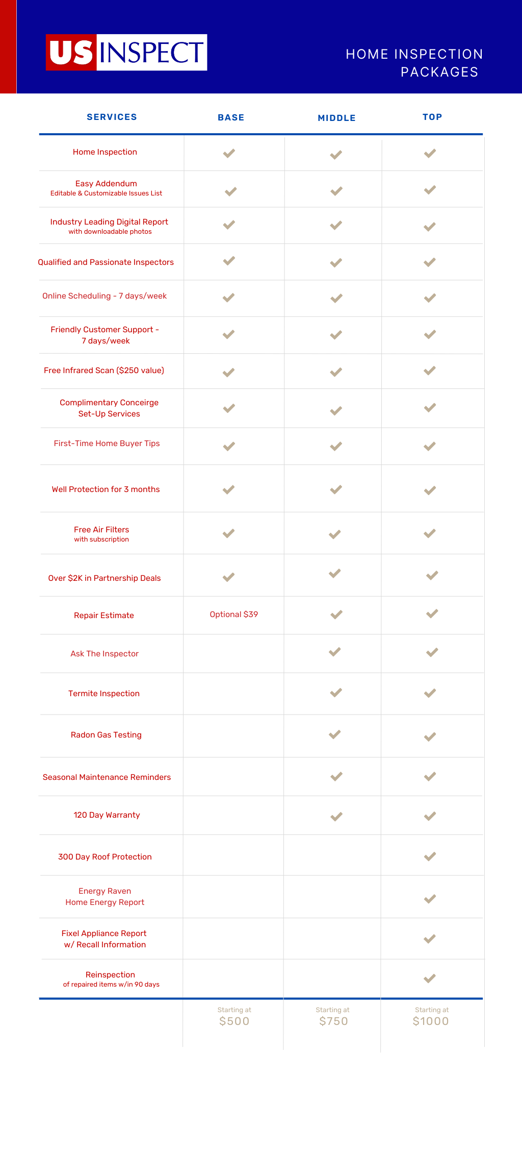 From basic home inspections to multiple inspection services, we’ve got you covered! US Inspect offers different inspection packages and options tailored to what you need!